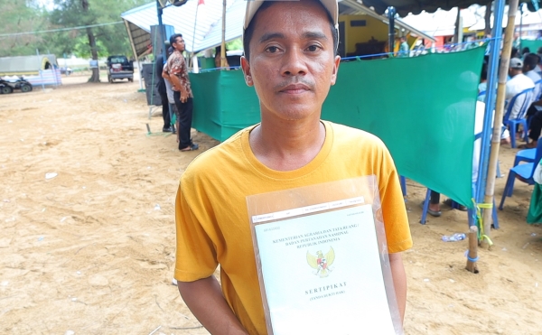Panyipatan - Penyerahan 147 sertifikat hak milik (SHM) atas tanah bagi para nelayan Tanah Laut (Tala) khususnya di dua desa yang terletak di Kecamatan Panyipatan yakni Desa Batakan dan Desa Tanjung Dewa oleh Penjabat (Pj) Bupati Tala, Ir. H. Syamsir Rahman memiliki arti tersendiri bagi para penerima.